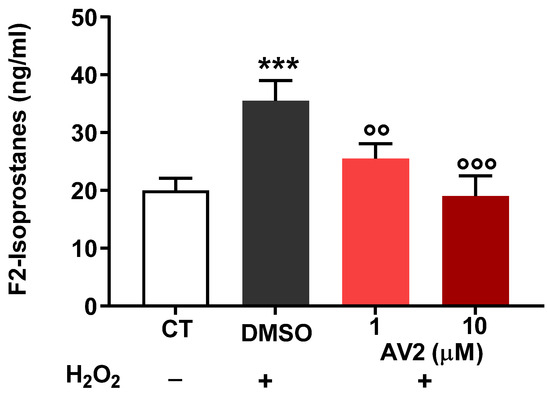Concentration of total F2-isoprostanes measured in SH cells after oxidative stress generated by H2O2 in the absence (DMSO) or presence of AV2 (1–10 µM). CT: control. *** p < 0.001 vs. CT; °° p < 0.01; °°° p < 0.001 vs. DMSO; (one-way ANOVA, p < 0.05, F = 12.7, with multiple comparisons).