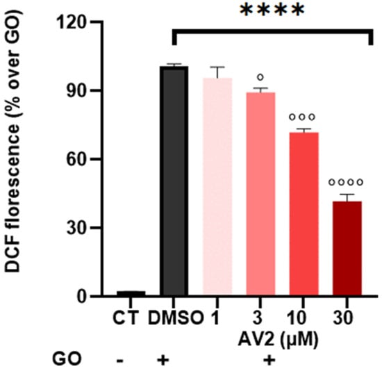 Cytoprotective activity of AV2 in vitro. Intracellular ROS formation in RAW264.7 cells produced by GO (DMSO), taken as 100%. CT: control. **** p < 0.0001 vs. CT; ° p < 0.05, °°° p < 0.001; °°°° p < 0.0001 vs. DMSO + GO; (one-way ANOVA p< 0.05; F = 4.12, with multiple comparisons).