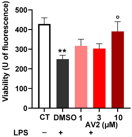 Effects of AV2 on LPS-induced damage in RAW264.7 cells. Cells were treated with LPS (1 μg/mL) in the absence (DMSO) or presence of AV2 at the indicated concentration for 24 h. Each bar represents the mean ± SEM calculated from three independent experiments. The significance was determined by one-way ANOVA (p < 0.0001, F = 7.36) with multiple comparisons. ** p < 0.01 vs. CT; ° p < 0.05 vs. DMSO + LPS. LPS: lipopolysaccharide. CT: control.