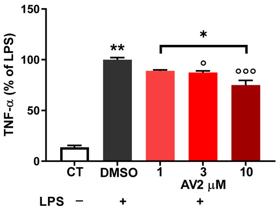 Effects of AV2 on LPS-induced TNF-α production in RAW264.7 cells. RAW264.7 cells were treated with LPS (1 µg/mL) in the absence (DMSO) (taken as 100%) or presence of AV2 for 24 h. TNF-α in the cultured supernatant was measured by ELISA. Each bar represents the mean ± standard deviation calculated from three independent experiments. The significance was determined by one-way ANOVA (F = 161.4; p < 0.0001), followed by multiple comparisons. * p < 0.05, ** p < 0.01 vs. CT; ° p < 0.05; °°° p < 0.001 vs. DMSO + LPS. CT, control; LPS, lipopolysaccharide; TNF-α, tumor necrosis factor-α.