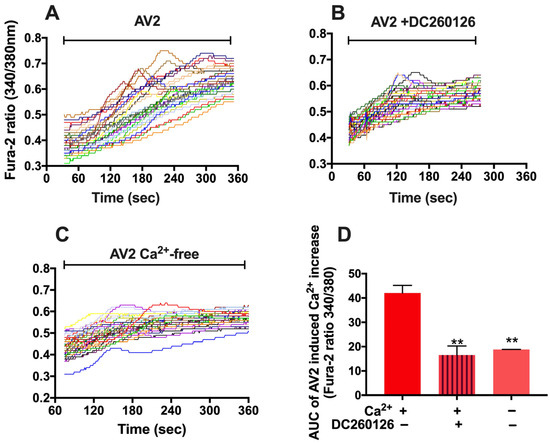 AV2 induces Ca2+ increase in SH cells. Intracellular Ca2+ was monitored over time in cells loaded with the Ca2+ indicator Fura-2 and stimulated withAV2 (10 µM) in a medium containing 1 mM CaCl2. The cells were stimulated with AV2 alone (A) or after 15 min pre-incubation with the FFAR1 antagonist DC260126 (B) or in Ca2+-free conditions (C). Each color represents a single cell response. In (D), the data of each bar represent the AUC of the mean ± SEM, calculated from three independent experiments. ** p < 0.01 vs. AV2 + Ca2+.