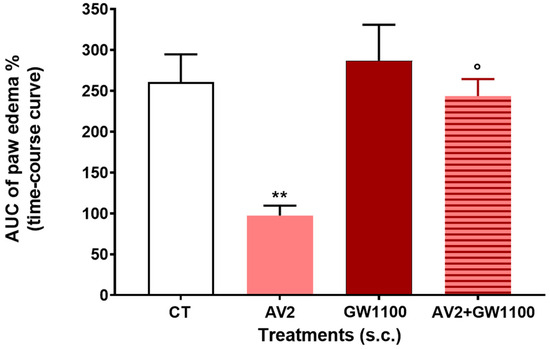 AV2, GW1100, and AV2 + GW1100 effects on paw edema induced by zymosan A. AV2 was administered at the dose of 100 μg/mouse, whereas GW1100 was administered at the dose of 10 μg/mouse 15 min before zymosan A; in the antagonism experiments, GW1100 was administered together with AV2, 15 min before zymosan A. Data were analyzed using one-way ANOVA, followed by Tukey’s multiple-comparisons test. F3,24 = 11.06, p < 0.0001; ** p < 0.01 vs. control (CT)-treated animals; ° p < 0.05 vs. AV2. (CT = DMSO/saline 1:5 v/v), n = 7.