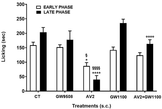 GW9580, GW1100, AV2, and AV2 + GW1100 effects in the formalin test after s.c. administration. GW9580 and AV2 were administered at the dose of 100 μg/mouse, whereas GW1100 was administered at the dose of 10 μg/mouse 15 min before formalin; in the antagonism experiments, GW1100 was simultaneously administered with AV2, 15 min before formalin. Data were analyzed using one-way ANOVA, followed by Tukey’s multiple-comparisons test. Early phase: F4,30 = 8.316, p < 0.0001. Late phase: F4,30 = 15.41, p < 0.0001; * p < 0.05 and **** p < 0.0001 vs. control (CT)-treated animals; § p < 0.05 and §§§§ p < 0.0001 vs. GW9508; °°°° p < 0.0001 vs. AV2. (CT= DMSO/saline 1:5 v/v), n = 7.