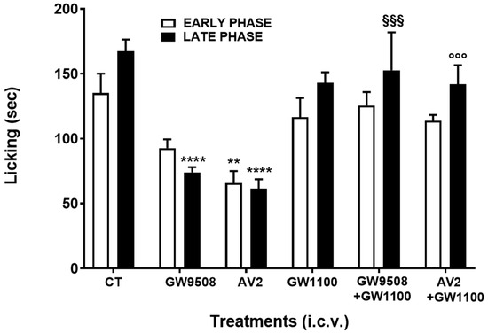 The effect of AV2 in the formalin test after intracerebroventricular (i.c.v.) administration was then investigated, and the results are reported in Figure 12. GW9508 administered i.c.v. at the dose of 1.0 μg/mouse significantly decreased licking duration in the late phase but not in the early phase of the formalin test (Figure 12). AV2 administered i.c.v. at the dose of 1.0 μg/mouse was able to reduce licking duration in both the early and late phase of the test. The FFAR1 antagonist GW1100 (1 µg/mouse), when simultaneously administered i.c.v. either with GW9508 or with AV2, reduced the antinociceptive effects of both compounds, as shown in Figure 12.