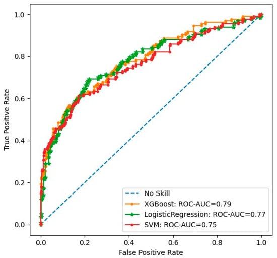 ROC-AUC curves for XGBoost, Logistic Regression, and SVM models.
