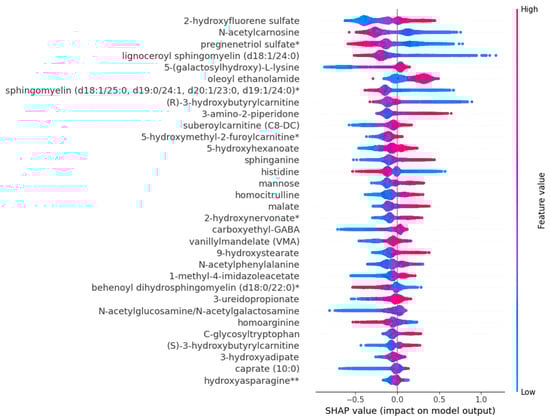 SHAP summary plot of the 32 most impactful predictors of mortality. A positive SHAP value means an increased risk prediction on mortality and a negative SHAP value indicates a protective effect. Each dot corresponds to a single observation and higher values of the variable are shown in red and lower values in blue. * indicates a tentatively identified metabolite; ** signify a well-characterized compound with minor identification uncertainty.