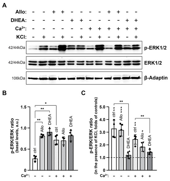 2.1. Neurosteroids Increase Basal p-ERK Levels Yet Attenuating Depolarization-Induced Phosphorylation of ERKs: An Effect More Pronounced in High [Ca2+]