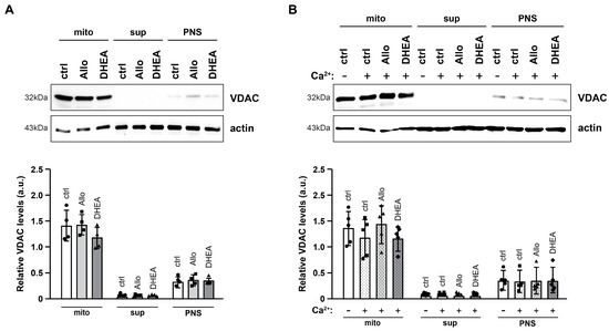 2.5. Mitochondrial Marker VDAC Levels Are Not Affected by Neurosteroids and Elevated [Ca2+]