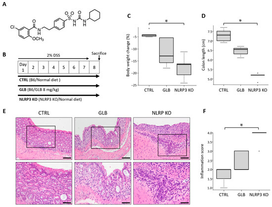 Effects of glyburide or NLRP3 deficiency on colitis induced by DSS (experiment 1). (A) Chemical structure of glyburide. (B) Study protocol of DSS-induced colitis. (C) Body weight change in the experimental mice. Percentage of weight loss at the end of the study compared to the beginning. (D) Colon length measured from the ileocecal junction to the anal verge. (E) Representative photographs of colon sections stained with hematoxylin and eosin. Enlarged pictures of the section enclosed within the square in the upper panels are shown in the corresponding lower panels. Scale bars: 100 µm for upper panels and 50 µm for lower panels. (F) Inflammation scores. Data represent mean ± standard error. * p < 0.05. CTRL, control (C57BL/6J) mice; DSS, dextran sodium sulfate; GLB, glyburide; KO, knockout.