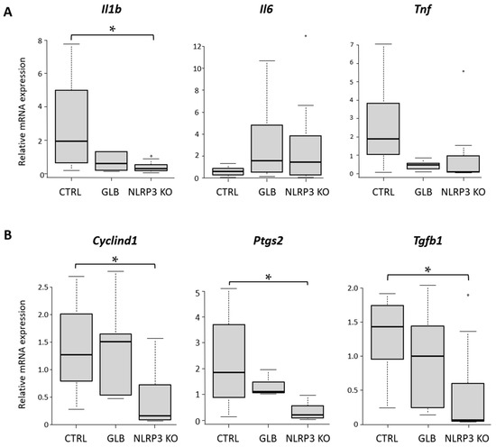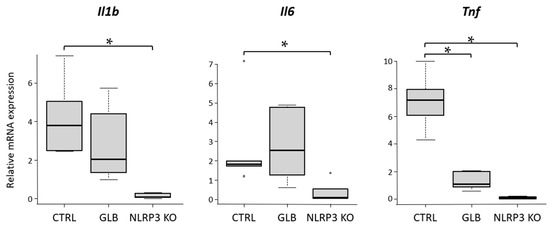 The inflammatory cytokines, namely Il1b, Il6, and Tnf, in the colonic mucosa were assessed (Figure 2). Gene expression levels of these cytokines were notably diminished in NLRP3-KO mice in comparison to the CTRL group. In mice subjected to GLB treatment, Tnf levels were substantially reduced in the colonic mucosa, while no significant differences were observed concerning the other investigated cytokines when compared to the CTRL group.