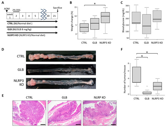 Interestingly, in the AOM/DSS-induced CRC model, NLRP3 deficiency and GLB treatment significantly reduced the number of tumors in the colorectum. Although Il6 was not markedly different from the control, the expression of inflammatory cytokines such as Il1b and Tnf was decreased in the colonic mucosa. In contrast to the present study, previous reports have indicated that NLRP3 deficiency leads to colorectal tumor progression [12,17]. This inconsistency might be caused by differences in the experimental protocols, including the administration period and concentration of agents involved.