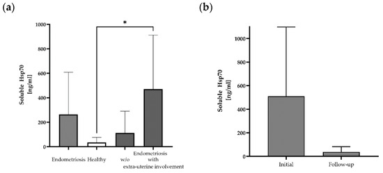 Soluble Hsp70 levels in the blood of patients with endometriosis and healthy controls. Free and lipid vesicle-associated Hsp70 levels [ng/mL] in the plasma of patients with histologically confirmed endometriosis (n = 12), a healthy cohort (n = 108) and a subgroup of endometriosis patients without (w/o) (n = 7) and with extra-uterine involvement (n = 5) (* p < 0.05 (Kruskal–Wallis test)) (a), and selected patients with endometriosis pre- (initial) and post-surgery (follow-up) (n = 3) (b), as determined using the Hsp70-exo ELISA.