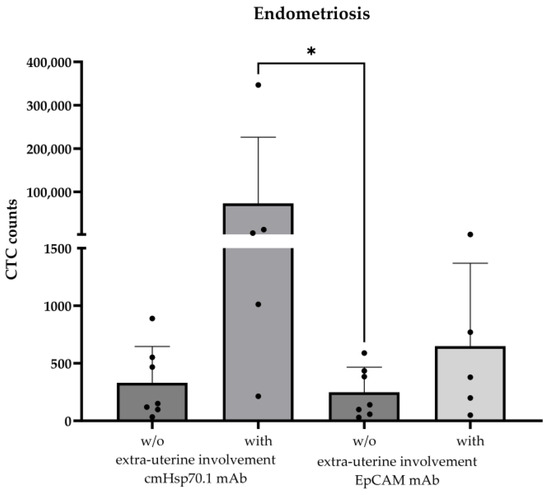 Comparison of cmHsp70.1 mAb- and EpCAM mAb-isolated circulating endometriotic cells (CECs) in the blood of patients without (w/o) (n = 7) and with (n = 5) endometriotic lesions in extra-uterine organs. CECs were derived from EDTA anti-coagulated blood (7.5 mL) of patients with histologically confirmed endometriosis (n = 12); * p < 0.05 (Kruskal–Wallis test).