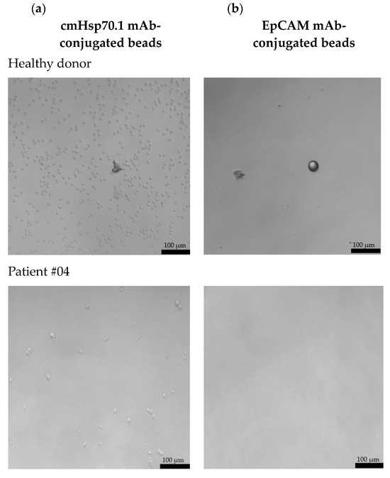 Morphology of cultured CECs isolated from the EDTA anti-coagulated blood (7.5 mL) of a healthy donor, patient #04 with histologically confirmed endometriosis (1 week in cell culture) and patients #07 and #10 with confirmed endometriosis and distant organ involvement (1 month in cell culture) using cmHsp70.1 (a) mAb- and EpCAM (b) mAb-conjugated beads. Magnification 20×; scale bar: 100 µm.