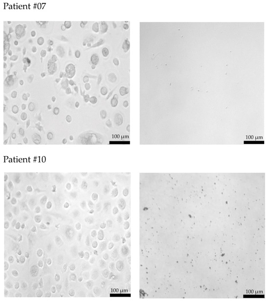 Freshly isolated CECs from all patients using cmHsp70.1 and EpCAM mAb-conjugated beads were cultured in DMEM medium supplemented with estrogen at 37 °C in 48-well plates. Representative examples of cultured CECs derived from the blood of patient #04 with histologically confirmed endometriosis after 1 week in cell culture, and patients #07 and #10 (both 1 month in cell culture) with endometriosis outside the uterine cavity, which were isolated via mHsp70 targeting (Figure 3a) and EpCAM (Figure 3b) targeting, are illustrated. Interestingly, after 1 week (patient #04) and 1 month (patients #07 and #10) in cell culture, all CECs isolated with EpCAM mAb-based beads lost their viability (Figure 3b), whereas those isolated with cmHsp70.1 mAb beads remained viable and became plastic-adherent (Figure 3a). In the case of blood from a healthy donor, no CECs, but erythrocytes (cmHsp70.1 mAb beads), and an isolation bead (EpCAM mAb beads) were detected after 1 week in cell culture.