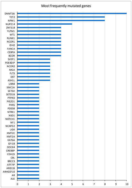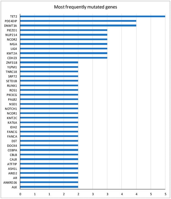 All 24 patients presented mutations at diagnosis with a range of 5 to 17 (median = 10) simultaneous mutations, the most frequent being DNMT3A (42%), NPM1 (33%), and TET2 (33%). In Figure 1, the most frequently mutated genes at diagnosis are represented.