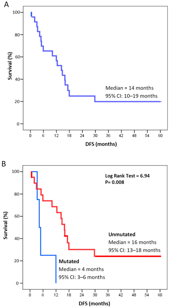 Kaplan–Meier survival curves for all 24 randomized patients (Figure 3A) and patients stratified for the presence of unmutated (N = 20) and mutated (N = 4) FANCA genes (Figure 3B) are shown. Median DFS in randomized patients was 14 months (95% CI: 10–19 months), higher in patients with unmutated FANCA genes (median DFS of 16 months, 95% CI: 13–18) versus those with mutated FANCA genes (median DFS of 4 months, 95% CI: 3–6 months, Log Rank test, p = 0.008) (Figure 3B).