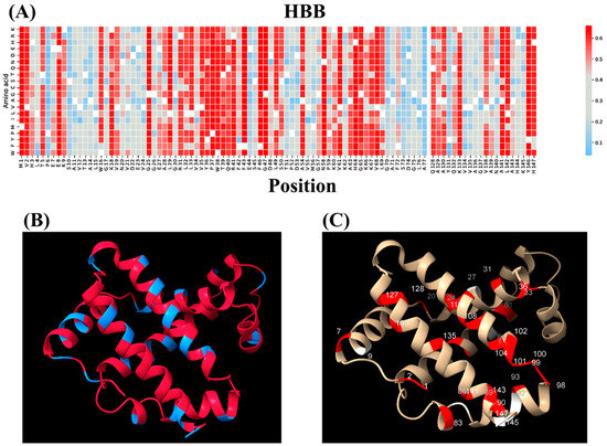 (A) Heatmap of EVE pathogenicity scores of HBB. For each amino acid, the scores were summed up and divided by 19. (B) Average unfolding fractions are represented on HBB, where high and low unfolding fractions are highlighted in red and blue, respectively. These values were pulled from UMS. (C) Overlap of pathogenic mutations and their impact on protein unfolding, where high pathogenicity score and unfolding fraction matches are highlighted in red, and matched residues not listed as pathogenic in ClinVar are highlighted in white.