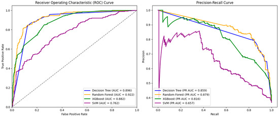 The Random Forest algorithm achieved the highest AUC (0.922), Recall (0.878), and PR AUC (0.847) scores. The Decision Tree algorithm achieved the greatest F1-score (0.813), accuracy (0.852), and precision (0.759). Of note, the SVM algorithm achieved the lowest results across all six metrics. In addition, a plot of the AUC and PR AUC curves for each algorithm is provided in Figure 2. The Random Forest algorithm achieved the highest AUC (0.922), followed by Decision Tree (0.896), XGBoost (0.882), and SVM (0.762). Of note, Random Forest performed significantly better than the latter two models (p < 0.005), but not significantly better than the Decision Tree (p = 0.414); in addition, XGBoost and Decision Tree performed significantly better than SVM (p < 0.005). The Random Forest algorithm also achieved the greatest PR AUC (0.879), followed by Decision Tree (0.859), Decision Tree (0.816), and SVM (0.657). The Decision Tree algorithm achieved the highest accuracy (0.852), followed by Random Forest (0.849), XGBoost (0.782), and SVM (0.690). Regarding precision, Decision Tree achieved the highest score (0.759), while SVM achieved the lowest score (0.569). Regarding recall, Random Forest achieved the highest score (0.878) and SVM achieved the lowest result (0.643). We conclude that the Random Forest algorithm performs the best in predicting the pathogenicity of mutations with unknown clinical significance.