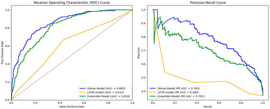 The Dense model achieved the highest AUC and PR AUC (0.860 and 0.783, respectively), followed by the Ensemble network (0.818, 0.702) and the LSTM model (0.612, 0.490).