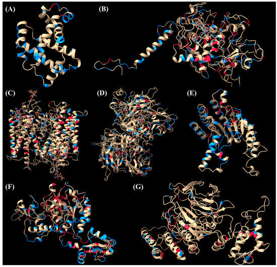 Predictions of the clinical significance of mutations with unknown significance by Random Forest. Red and blue residues are predicted to be pathogenic and benign, respectively. The proteins are as follows: (A) HBB, (B) TYRP1, (C) RHO, (D) RPE65, (E) DHDDS, (F) IMPDH1, (G) KLHL7.