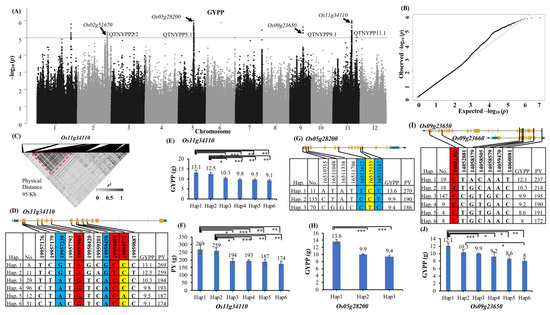 Identification of candidate genes associated with grain yield per plant (GYPP) in low-P field conditions. (A) Manhattan plot of GYPP with EMMAX model showing QTNs and associated candidate genes (highlighted with arrows). Horizontal lines in the Manhattan plots indicate the genome-wide thresholds -log P values of 5 (blue) and 7.5 (red). (B) Q–Q plot for GYPP. The dashed (red) line in Q–Q plot represents significance threshold, whereas black dots represent observed values. (C) Zoomed-in SNP likelihood LD (linkage disequilibrium) heatmap showing the peak SNP and the position of candidate gene Os11g34110 within the dotted red triangle. Gene structure of candidate genes—(D) Os11g34110, (G) Os05g28200 and (I) Os09g23650—with haplotype analysis of peak SNPs. The orange, blue and white colors represent exons, UTR and introns, respectively. Nonsynonymous SNPs are in bold; the blue-, red- and yellow-colored columns represent peak, deleterious SNP (SIFT score < 0.05) and the splice variant, respectively. The average value for a particular haplotype (hap.) for GYPP and PY, along with the number of genotypes (no.), is indicated. Phenotypic variation among haplotypes for GYPP and PY with significant values (t-test) indicated as * (p < 0.05), ** (p < 0.01) and *** (p < 0.001), respectively, for candidate genes—(E) and (F) Os11g34110, (H) Os05g28200 and (J) Os09g23650.