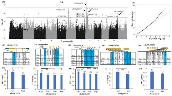 Identification of candidate genes associated with phosphorus utilization efficiency (PUE). (A,B) Manhattan plot and Q–Q plot of PY, GYPP and PUE with EMMAX model showing QTNs and associated candidate genes (highlighted with arrows). Horizontal lines in the Manhattan plots indicate the genome-wide thresholds -log P values of 5 (blue) and 7.5 (red). The dashed (red) line in Q–Q plot represents significance threshold, whereas black dots represent observed values. Gene structure of candidate genes—(C) Os06g12250, (E) Os08g04810, (G) Os08g06070, (I) Os08g10260, and (K) Os11g45540 with a haplotype analysis of peak SNPs. Orange, blue and white colors represent exons, UTR and introns, respectively. Nonsynonymous SNPs are in bold; the blue-colored columns represent peak SNP. The average value for a particular haplotype (hap.) for PUE, along with the number of genotypes (no.), is indicated. (D,F,H,J,L) Phenotypic variation among haplotypes for PUE with significant values (t-test) indicated as ** (p < 0.01) and *** (p < 0.001), respectively, for candidate genes.