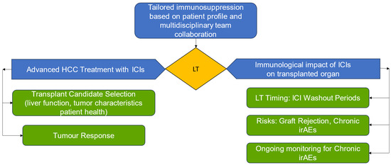 Recent studies have explored the effectiveness of combining LT with immunotherapy and locoregional therapies (LRTs), aiming to improve outcomes and reduce recurrence rates. LRTs, such as transarterial embolization (TAE) and ablation, can further reduce tumour burden when used alongside ICIs [70,71,72,73,74,75,76,77,78,79,80,81,82,83,84,85,86,87,88].