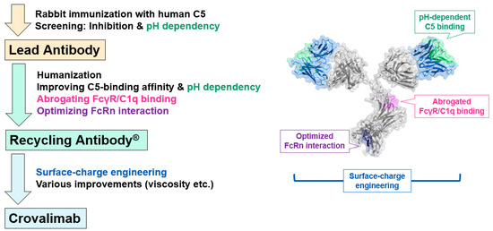 This study elucidates the innovative molecular design and function of the recently approved crovalimab, carefully engineered to enable its optimized Q4W maintenance SC dosing regimen, thereby addressing critical unmet needs in the treatment of PNH [50], where lifelong management is required. Crovalimab was created through a process including rabbit immunization, humanization, recycling antibody generation by improving pH-dependent antigen binding and optimizing FcRn interaction, and surface-charge engineering (Figure 1).