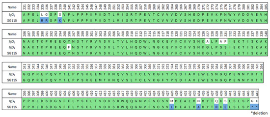Amino acid alignment of crovalimab with human germline sequences. The amino acid sequence of the crovalimab Fc region (SG115) is shown together with the human IgG1 and IgG4 sequences. The green and blue regions in the sequence of SG115 indicate, respectively, the human-derived sequences and the artificial mutations introduced to improve the properties of the antibody. Ig, immunoglobulin.