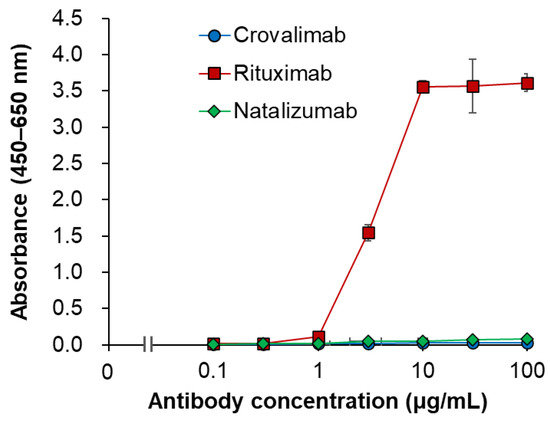 Antibody solutions were prepared by diluting crovalimab, rituximab, and natalizumab in phosphate-buffered saline. These solutions were then immobilized onto 96-well plates and incubated at 4 °C overnight. After immobilization, the plates were washed and subjected to blocking for 2 h at room temperature. The assay continued with the addition of human C1q protein (Merck Millipore Corporation, Burlington, MA, USA) diluted to 3 μg/mL, followed by 1 h incubation. Detection was performed using a sheep anti-human C1q antibody (Bio-Rad Laboratories, Inc., Hercules, CA, USA), with the subsequent addition of 3,3′,5,5′-tetramethylbenzidine chromogen solution (Thermo Fisher Scientific Inc.) for 10 min. The reaction was stopped, and the absorbance was measured at 450 nm, using 650 nm as a reference wavelength. The absorbance data were analyzed to quantify C1q binding.