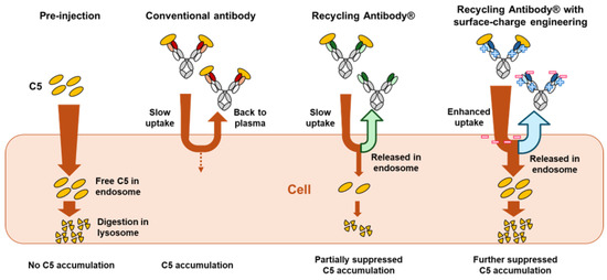Figure 7 provides a comparative visualization of the cellular uptake of the immune complex and the impact on C5 accumulation among various antibody types, including conventional non-pH-dependent antibodies, recycling antibodies without charge engineering, and recycling antibodies that have surface-charge engineering (i.e., crovalimab). Non-pH-dependent conventional antibodies can cause C5 accumulation in the plasma, due to the formation of immune complexes between C5 and the antibody, which decreases C5 clearance [31]. The introduction of a pH-dependent C5 binding property can partially suppress this antigen accumulation. Additionally, the novel engineering of the surface charge, as employed in crovalimab, enhances the cellular uptake of immune complexes, further reducing C5 accumulation without compromising the prolonged antibody pharmacokinetics. This advanced mechanism promotes the expedited clearance of C5, thereby reducing the dosage requirements.