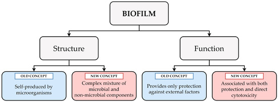 A graph showing the complexity of biofilm and its dual nature at both the structural (a complex mixture of components from microbial and non-microbial origin) and functional (an ability to promote microbial survival and direct cytotoxicity against host cells) levels.