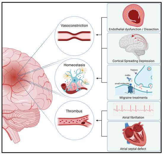Cortical spreading depression is a phenomenon characterized by a wave of depolarization that starts in the occipital lobe and migrates to the frontal lobe at a rate of approximately 1–2 mm/s. There is considerable evidence that CGRP plays a complex role in the development of CSD, primarily through its effects on cerebral blood vessels and the trigeminovascular system. However, CGRP-pathway mAbs have not been shown to reduce migraine aura in patients with MA [51,52]. Cortical spreading depression is associated with the clinical manifestation of a migraine aura, whereas CSD has also been observed in the penumbral tissue of ischemic stroke patients. CSD causes an ion translocation between neuronal cell bodies and the interstitium and an increase in energy consumption. In healthy brain tissue, increased energy turnover can be balanced by subsequent vasodilation. However, in energy-compromised tissue, such as the penumbra in ischemic stroke, this CSD could result in cell death. CSD has also been observed to result in the release of excitotoxic glutamate, which could lead to an additional risk of cell death in the penumbra [53]. Figure 2 identifies the most common and significant risk factors for stroke in migraineurs.