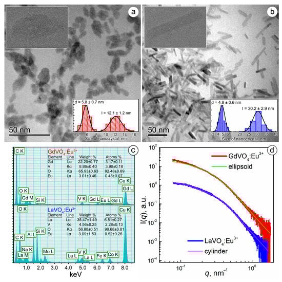 TEM images of the GdVO4:Eu3+ (Panel (a)) and LaVO4:Eu3+ (Panel (b)) nanoparticles (the insets show the size distribution diagrams and high-resolution micrographs of the synthesized nanoparticles). EDS spectra of the synthesized nanoparticles (Panel (c)). Experimental SAXS curves for the GdVO4:Eu3+ and LaVO4:Eu3+ nanosized materials from the as-prepared aqueous solutions (Panel (d)). The solid lines show the best fit to both the ellipsoidal and cylinder model.