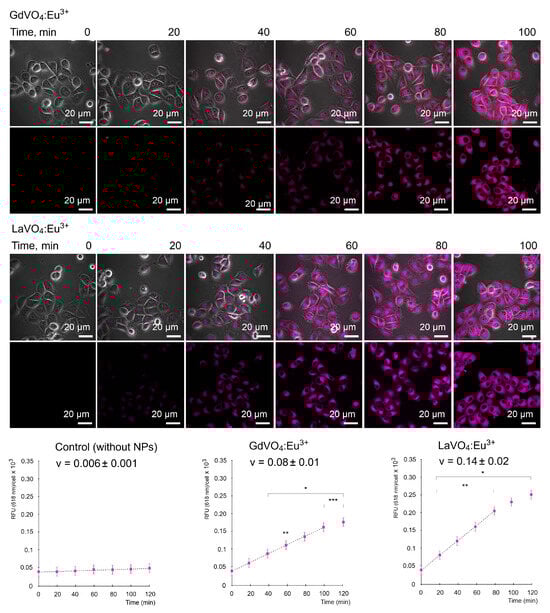 The photoluminescence excitation and emission properties of the GdVO4:Eu3+ or LaVO4:Eu3+ NPs in the UV-A and visible regions (350–700 nm) were acquired by a Lumina Fluorescence Spectrometer (Thermo Fisher Scientific, Waltham, MA, USA). The excitation spectrum showed an intense absorption band in the UV-A region at 390 nm. Excitation resulted in the appearance of a strong narrow red emission at 618 nm []. Briefly, the internalization of the GdVO4:Eu3+ or LaVO4:Eu3+ NPs were evaluated by adding NPs to the culture medium at a concentration of 20 mg/L, with further measurements of the relative fluorescence being emitted at 0, 20, 40, 60, 80, and 100 min. Prior to imaging, the culture medium with GdVO4:Eu3+ or LaVO4:Eu3+ NPs was removed and replaced with a pre-warmed live-cell imaging solution (Life Technologies, Carlsbad, CA, USA). The images of the live cells were captured by confocal microscopy at an excitation of 391 nm and an emission of 618 nm. Cellular uptake was calculated in the linear region of the fluorescence intensity curves.