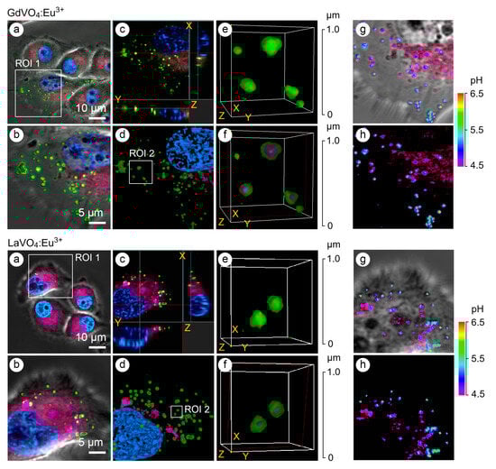 Representative LSCM images of the endosome-positive L929 cells following treatment with GdVO4Eu3+ and LaVO4Eu3+ nanoparticles at 20 mg/L for 1 h. The L929 cells were transfected with GFP-Rab5a/GFP-Rab7a and, 24 h after transfection, the cells were exposed to the investigated NPs. The Rab5a and Rab7a proteins were markers of the early and late endosomes, respectively. The GFP-Rab5a/GFP-Rab7a-positive endosomes (green) and NPs’ autofluorescence signals (magenta) were detected. The cell nuclei are shown in blue (DAPI staining). Single-optic section phase contrast and fluorescence-merged imaging (Panel (a)); magnified single-optic section fluorescence imaging of the ROI1 (Panel (b)); orthogonal XZ and YZ projections of the ROI1 (Panel (c)); 3D reconstruction of the ROI1 (Panel (d)); complete 3D reconstruction of the endosomes without and with the NPs’ fluorescence channel (magenta) of the ROI2 (Panel (e)); cross section of the endosomes (red frame) demonstrating the intra-endosomal localization of the NPs (magenta) of the ROI2 (Panel (f)); and pseudocolored and phase-contrast imaging of the endosomal pH using the LysoSensor ratiometric probe (molecular probes, L22460) of the ROI1 (Panels (g,h)). Ratiometric pseudocolored images were constructed from two emission images at 450 ± 33 nm and 510 ± 20 nm, respectively. Both were excited at 365 ± 8 nm. The cells were preliminarily exposed to pH calibration buffers (pH 4.5–6.5).
