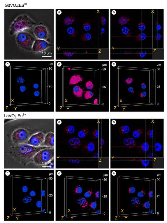 Confocal microscopy images with an orthogonal projection and 3D reconstruction of the L929 cells treated with the GdVO4Eu3+ and LaVO4Eu3+ nanoparticles at 20 mg/L for 60 min: orthogonal projection (white and red lines) of the cells with highly condensed (Chromatin Condensation Index, CCI = 17.2 ± 4.9) heterochromatin (Panel (a)); orthogonal projection (white and red lines) of the cells with regularly condensed (CCI = 6.8 ± 2.5) heterochromatin (Panel (b)); complete 3D reconstruction of the cells not showing (Panel (c)) and showing (Panel (d)) the channel of nanomaterials-dependent fluorescence (magenta); and cross section of the cell nuclei (red frame) (Panel (e)). Cell nuclei are shown in blue (DAPI staining).