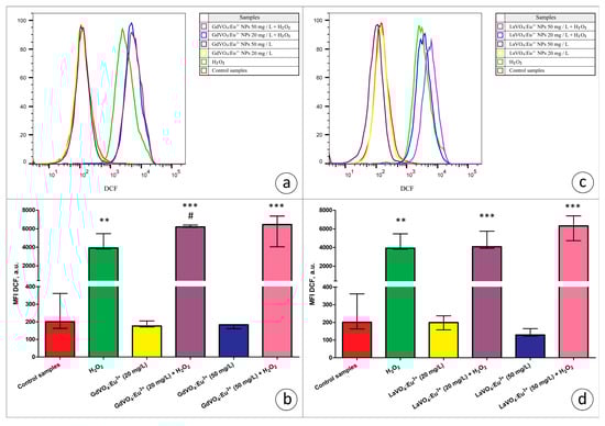 The rare-earth orthovanadate nanoparticles enhanced H2O2-mediated oxidative stress in the L929 cells. The GdVO4:Eu3+ nanoparticles increased the DCF-mediated fluorescence in the H2O2-treated samples (3 μM), indicating an increase in the ROS production in the L929 cells (Panels (a,b)). Likewise, the LaVO4:Eu3+ nanoparticles promoted H2O2-induced redox imbalance in the L929 cells (Panels (c,d)). At the same time, exposure of the L929 cells to both nanoscale materials used does not impair redox homeostasis. ANOVA and post hoc Bonferroni tests were conducted, and the Me and IQR (n = 3) were determined. Note: ** (p < 0.01); and *** (p < 0.001) were compared with the control samples. # (p < 0.05); were compared with the H2O2-treated samples.