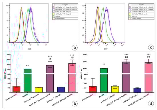 The GdVO4:Eu3+ and LaVO4:Eu3+ nanoparticles aggravated tBuOOH-induced impairment of redox homeostasis in the L929 cells. The GdVO4:Eu3+ (Panels (a,b)) and LaVO4:Eu3+ nanoparticles (Panels (c,d)) enhanced ROS generation in the L929 cells exposed to tBuOOH (0.5 mM). Data were statistically processed using ANOVA and post hoc Bonferroni tests, and the Me and IQR (n = 3) were determined. Note: ** (p < 0.01); and *** (p < 0.001) were compared with the control samples. # (p < 0.05); ## (p < 0.01) were compared with the tBuOOH-treated samples.