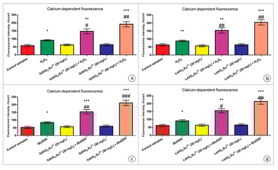 The GdVO4:Eu3+ and LaVO4:Eu3+ nanoparticles triggered Ca2+ elevation in the oxidatively damaged L929 cells. The GdVO4:Eu3+ (Panels (a,c)) and LaVO4:Eu3+ nanoparticles (Panels (b,d)) affected the calcium-specific fluorescence intensity in the L929 cells exposed to H2O2 and tBuOOH, respectively. ANOVA and Tukey’s tests were conducted, and the mean ± SEM (n = 3) were determined. Note: * (p < 0.05); ** (p < 0.01); and *** (p < 0.001) were compared with the control samples. # (p < 0.05); ## (p < 0.01); and ### (p < 0.001) were compared with the H2O2- or tBuOOH-treated samples. Rfu—relative fluorescence units.