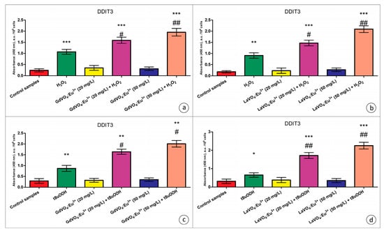 The GdVO4:Eu3+ and LaVO4:Eu3+ nanoparticle-induced damage to oxidatively stressed L929 cells was mediated by DDIT3. The GdVO4:Eu3+ (Panels (a,c)) and LaVO4:Eu3+ nanoparticles (Panels (b,d)) increased the DDIT3-specific absorbance in the L929 cells exposed to H2O2 and tBuOOH, respectively. ANOVA and Tukey’s tests were conducted, and the mean ± SEM (n = 3) were determined. Note: * (p < 0.05); ** (p < 0.01); and *** (p < 0.001) were compared with the control samples. # (p < 0.05); ## (p < 0.01) were compared with the H2O2- or tBuOOH-treated samples. A.u.—arbitrary units.