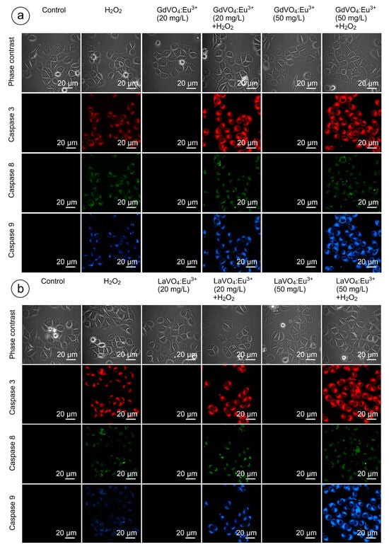 LSCM representative images of the caspase-3-, caspase-8-, and caspase-9-specific fluorescence in the L929 cells after incubation with the GdVO4Eu3+ (Panel (a)) or LaVO4Eu3+ (Panel (b)) nanoparticles in the presence of H2O2. Scale bar is 20 µm.