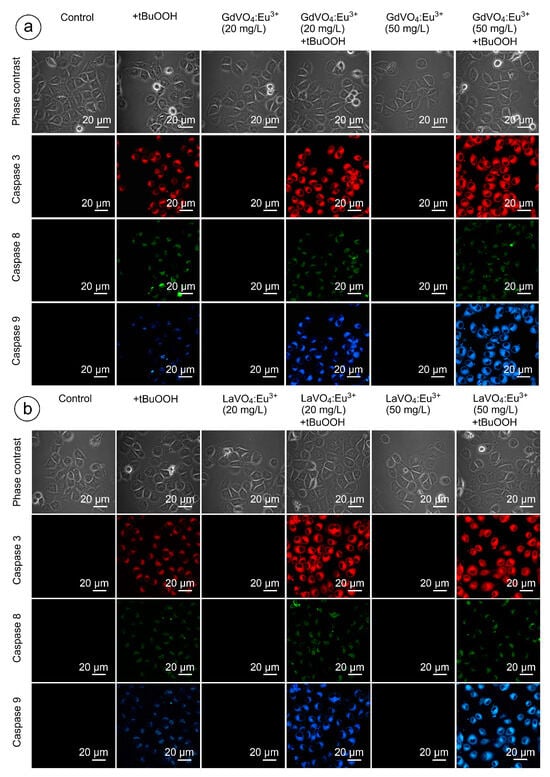 Representative confocal microscopy images show caspase-3-, caspase-8-, and caspase-9-specific fluorescence in tBuOOH-treated L929 cells exposed to GdVO4Eu3+ (panel (a)) or LaVO4Eu3+ (panel (b)) nanoparticles. Scale bar is 20 µm.