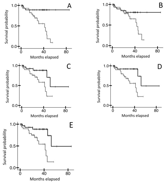 Kaplan–Meier (KM) overall survival (OS) analyses of TCGA-UVM case IDs based on intrinsic disorder assessments as applied to TRB V-CDR3-J AA sequences from blood sample WXS files. (A) Case IDs representing the bottom 50% of VSL2 scores (black line, n = 32, median OS N/A) versus the top 50% (grey line, n = 32, median OS 41.7 months). Log-rank p-value = 0.002. (B) Case IDs representing the bottom 50% of VL3 scores (black line, n = 32, median OS N/A) versus the top 50% (grey line, n = 32, median OS 43.2 months). Log-rank p-value = 0.066. (C) Case IDs representing the bottom 50% of IUPred2 short scores (black line, n = 32, median OS 52.0 months) versus the top 50% (grey line, n = 32, median OS 41.7 months). Log-rank p-value = 0.014. (D) Case IDs representing the bottom 50% of IUPred2 long scores (black line, n = 32, median OS 52.0 months) versus the top 50% (grey line, n = 32, median OS 41.7 months). Log-rank p-value = 0.004. (E) Case IDs representing the bottom 50% of ANCHOR2 scores (black line, n = 32, median OS 52.0 months) versus the top 50% (grey line, n = 32, median OS 41.7 months). Log-rank p-value = 0.003.