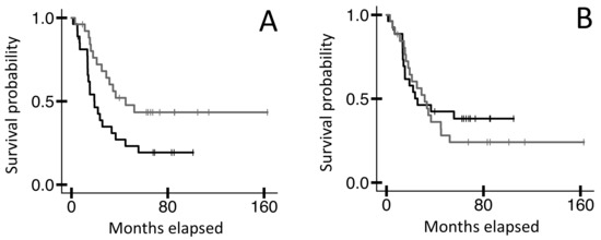 KM OS analyses of TCGA-UVM case IDs based on physico-chemical parameters of TRB CDR3 AA sequences (Table S5) from blood sample WXS files. (A) Case IDs representing the bottom 50% of the proportion of disorder-promoting residues (black line, n = 32, median OS N/A months) versus the top 50% (grey line, n = 32, median OS 45.3 months). Log-rank p-value = 0.022. (B) Case IDs representing the bottom 50% of the proportion of helix-promoting residues (black line, n = 32, median OS 45.3 months) versus the top 50% (grey line, n = 32, median OS 52.0 months). Log-rank p-value = 0.631. Similarly to the proportion of helix-promoting residues, two other physico-chemical parameters, namely the proportion of sheet-promoting residues and turn-promoting residues, did not reflect significant OS distinctions.