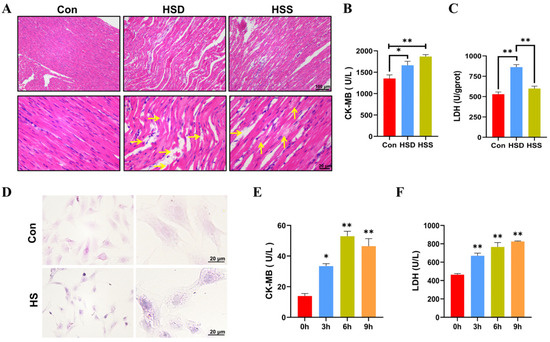 Establishment of heat-stressed cardiomyocyte models in vitro and in vivo in WCCs. (A) Myocardial tissues in WCCs were stained by H&E staining. Scale bars: 2 μm (top) and 500 nm (bottom), n = 3. Vertical yellow arrow: swelling of cardiac fibers, horizontal yellow arrow: myocardial fiber rupture. (B) The levels of CK-MB in the serum of heat-stressed WCCs were detected. Data are presented as the mean ± SEM. * p < 0.05, ** p < 0.01, n = 3. (C) The levels of LDH in the myocardial tissue of heat-stressed WCCs were detected. Data are presented as the mean ± SEM. ** p < 0.01, n = 3. (D) Heat-stressed PCWs for 3 h (HS) were stained by H&E (scale bar: 20 μm). In each group, the image on the right is a partial enlargement of the image on the left. (E) The levels of CK-MB in the supernatant of heat-stressed PCWs cultures were measured. * p < 0.05, ** p < 0.01, n = 3. (F) The levels of LDH in the supernatant of heat-stressed PCWs cultures were measured (n = 3). The differences in the data of cells heat-stressed for different times vs. those heat-stressed for 0 h are indicated by * p < 0.05 and ** p < 0.01, n = 3.