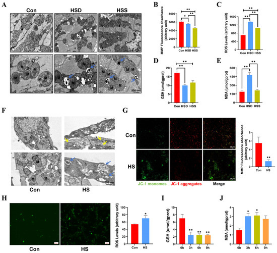 Heat stress induces mitochondrial dysfunction in cardiomyocytes and PCWs, leading to oxidative stress. (A) TEM images showing mitochondrial morphology and autophagosomes in heat-stressed cardiomyocytes. M indicates mitochondria; blue arrows point to mitochondrial autophagosomes. Scale bars: 2 μm (top) and 500 nm (bottom). (B) The mitochondrial membrane potential (MMP) in the myocardial tissue of heat-stressed WCCs were detected; data are presented as the mean ± SEM. * p < 0.05, ** p < 0.01, n = 3. The levels of ROS (C), GSH (D), and MDA (E) in the myocardial tissue of heat-stressed WCCs were detected. Data are presented as the mean ± SEM. ** p < 0.01, n = 3. (F) TEM images showing the presence of abnormally shaped mitochondria and autophagosomes in the Con group and heat-stressed PCWs for 3 h (HS). Blue arrows point to autophagosomes, and yellow arrows point to mitochondria with disrupted cristae. Scale bars: 2 μm (top) and 500 nm (bottom), n = 3. (G) PCWs were treated with heat stress for 3 h and then treated with a JC-1 probe and observed under a fluorescence microscope. The representative images for each condition are shown. Scale bars: 20 μm. Red fluorescence represents JC-1 aggregates, and green fluorescence represents JC-1 monomers, ** p < 0.01, n = 3. (H) The ROS levels of PCWs were determined after exposure to heat stress for 3 h. * p < 0.05, n = 3. The GSH (I) and MDA (J) levels of PCWs were determined after exposure to heat stress for different times. The differences in the data of cells heat-stressed for different times vs. those heat-stressed for 0 h are indicated by * p < 0.05, ** p < 0.01, n = 3.