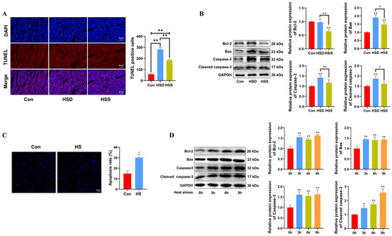 Heat stress induces apoptosis in cardiomyocytes and PCWs. (A) TUNEL staining was performed in the myocardial tissue of WCCs following treatment with heat stress. Apoptosis was determined by TUNEL staining (red) and the nuclei were stained with DAPI (blue). TUNEL positive ratio is defined as the number of TUNEL positive cells divided by the total number of cells. Values are presented as the mean ± SEM of three individual experiments, Scale bars: 50 μm, ** p < 0.01, n = 3. (B) Measurement of protein expression of apoptosis-related proteins Bcl-2, Bax, Caspase-3, and cleaved caspase-3 in myocardial tissues of WCCs treated with heat stress by Western blot analysis, normalized to GAPDH. Measurement data are expressed as mean ± SEM. * p < 0.05, ** p < 0.01, n = 3. (C) Hoechst 33342 staining was performed in heat-stressed PCWs for 3 h, scale bars: 50 μm, * p < 0.05, n = 3. (D) After exposure to heat stress for different times, Bcl-2, Bax, Caspase-3, and Cleaved caspase-3 in whole cells were detected via Western blot analysis with the indicated antibodies. Representative bands are shown. The differences in the data of cells heat-stressed for different times vs. those heat-stressed for 0 h are indicated by * p < 0.05 and ** p < 0.01.