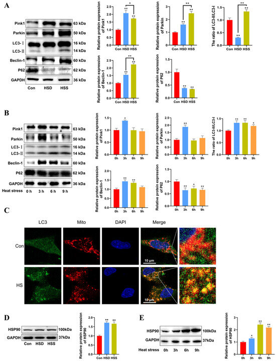 We previously observed mitophagosomes in heat-stressed cardiomyocytes and PCWs. We hypothesize that mitophagy may play a protective role in heat-stressed cardiomyocytes. To investigate this, we examined the levels of mitophagy-related proteins using Western blot in heat-stressed cardiac tissues. The results indicated that the LC3-II/LC3-I ratio was significantly decreased in the HSD group but significantly increased in the HSS group. Furthermore, compared to the Con group, the levels of Beclin-1, Pink1, and Parkin were significantly elevated, while P62 levels were markedly reduced in the cardiac tissues of both the HSD and HSS groups (Figure 4A). Compared with 0 h, there were significant increases in the LC3-II/LC3-I ratio in the heat-stressed PCWs at 3, 6, and 9 h, accompanied by a notable decrease in P62 levels. Additionally, the expression of Beclin-1, Pink1, and Parkin significantly increased after 3 h of heat stress (Figure 4B). The fluorescent signals indicating mitochondrial colocalization with LC3 in PCWs significantly increased after 3 h of heat stress (Figure 4C). These findings suggest that heat stress initiates mitophagy in cardiomyocytes of WCCs. HSP90 serves as a major hub within the molecular chaperone network and regulates mitochondrial autophagy by stabilizing client proteins [24]. To evaluate HSP90 expression during heat stress, we assessed the protein levels of HSP90 using Western blott. The results demonstrated that HSP90 expression levels were significantly upregulated in the cardiac tissues of both the HSS and HSD groups (Figure 4D). Furthermore, we analyzed HSP90 expression levels in heat-stressed PCWs at various time points. Compared to the levels at 0 h, HSP90 expression was significantly elevated at 3, 6, and 9 h of heat stress (Figure 4E). These results indicate that heat stress induces mitophagy in cardiomyocytes and upregulates HSP90 expression in cardiomyocytes of WCCs.